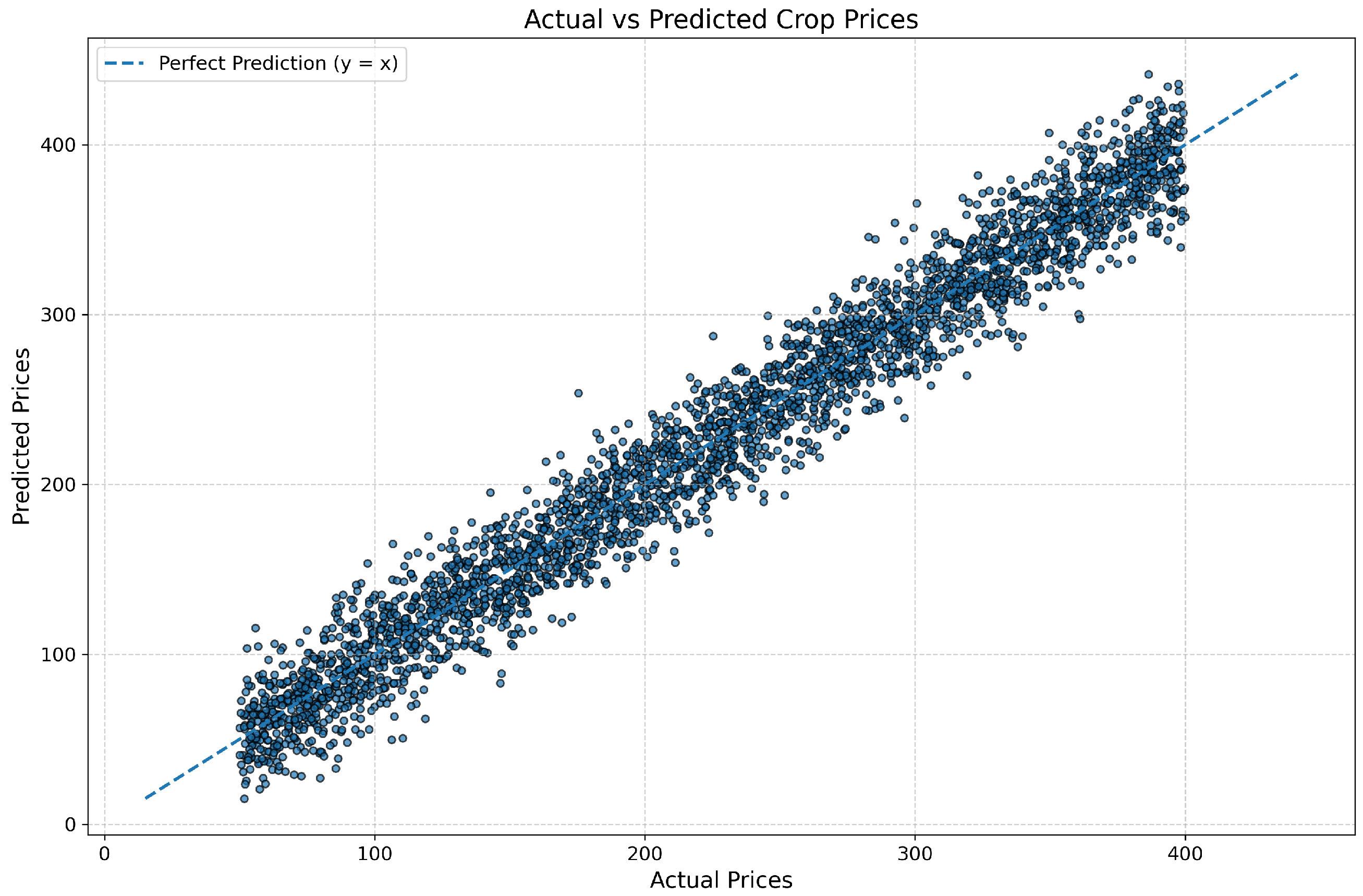 The fact versus prediction price plot, displayed on the next page, has a heavy concentration of data points toward the diagonal reference line, indicating a good fit between model predictions and true market prices. Such a tight clustering indicates the high predictive accuracy of the model and its generalisation capacity over a range of crop prices. Finally, the lack of any systematic deviation indicates that the model is consistent across low, medium and high prices. There is a small deviation at the two price extremes, but we would not expect our historical context to match exactly with current or future market conditions, particularly with the definition of unpredictable supply shocks and unobserved externalities. In general, that visual pattern supports the numerical evaluation metrics and provides evidence that the XGBoost model can generate consistent, accurate and reliable predictions for crop prices.
