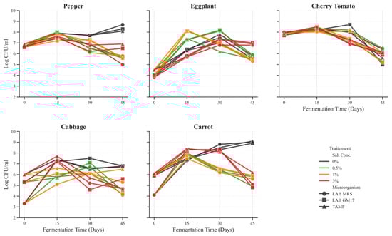 Kinetics of microbial population dynamics during the spontaneous fermentation of five vegetable matrices under varying NaCl concentrations. Data points represent the mean Log CFU/mL ± SD (n = 3). Lines are colored according to salt concentration (0% control to 3%), and markers distinguish microbial groups (● Lactic Acid Bacteria (LAB) cultured on MRS, ■ LAB cultured on GM17, ▲ Total Aerobic Mesophilic Flora (TAMF)).