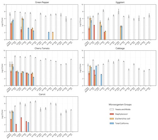 The evolution of spoilage and pathogenic microorganisms across NaCl concentrations (0–3%) is shown in Figure 3. Lactic acid fermentation effectively suppressed foodborne pathogens while maintaining moderate yeast and mold levels. In all vegetable matrices, S. aureus, E. coli, and total coliforms declined rapidly, disappearing completely by 15–30 days depending on salt concentration, while yeast and mold counts stabilized or decreased after 30 to 45 days.