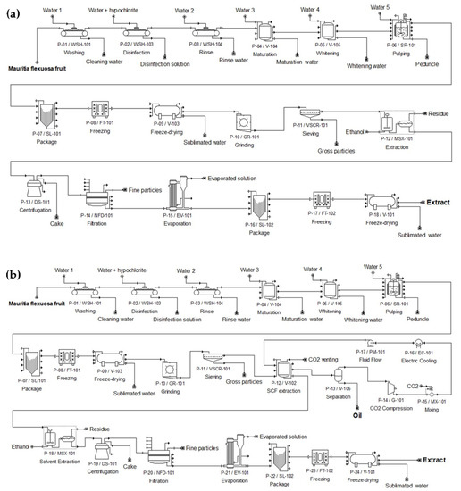 Conventionally, for the recovery of oil and phenolic-rich extracts from M. flexuosa, supercritical adsorption [5] and solid–liquid extraction [2,3,4] are used, respectively. In some of these processes, large volumes of petroleum-derived solvents are required, as well as a long extraction time, which could reduce the quality of the bioactive compounds obtained [9]. A strategy to reduce costs without affecting the quality of these products is the intensification of processes that allow efficient use of energy and capital while improving techno-economic parameters [10].