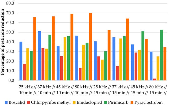 Ultrasound baths were also demonstrated to be an effective method of pesticide-residue reduction. Each combination of time–frequency managed to lower the selected pesticides where, again, chlorpyrifos was a tough contestant with an average diminution of just 0%. On the other hand, pyraclostrobin had an average of 58%, with a maximum of 70%. Once more, despite the differences among the pesticides, the combinations did not show differences when analyzed with the ANAVA test Pillai Bartlett with alfa 0.05.