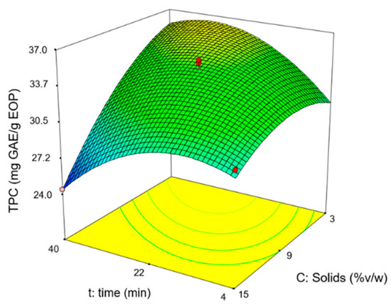 In the experimental design, the values obtained for the total phenol content (TPC) ranged from 25 to 41 mg GAE/g EOP and the hydroxytyrosol content between 4 and 6 mg/g EOP. As an example, Figure 1 shows the response surface for the TPC, where it can be observed that the extraction time and solid loading have a positive influence until a maximum is reached. Alternatively, the temperature was affected positively under the conditions tested. The hydroxytyrosol content showed a similar trend.