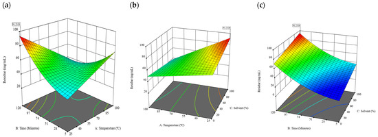 Figure 1 shows the optimal points with the highest extraction yield, ploting two factors in each graph, maintaining the third at the optimal point. Thus, it is clear that in Figure 1a, low temperature, and 120 min promote extraction yield, which is in acordance with Figure 1b, in which low temperature and a high percentage of ethanol also promotes the dry residue. Finally, in Figure 1c, long extraction time and a high amount of ethanol show higher yields.