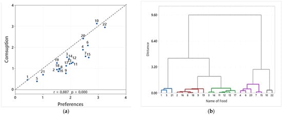Based on the data from the questionnaires, the respondents’ average consumption and preferences were calculated for all these 22 vitamin D-containing foods (Table 1). The obtained values of consumption and preferences correlated with each other with Pearson correlation r = 0.887 (Figure 1a). The data analysis allowed us to trace several patterns: