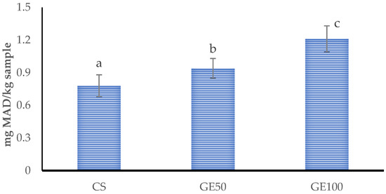 The lipid oxidation values of Frankfurt-type sausage formulates replacing pork backfat with gelled emulsion elaborated with peanut flour and flaxseed oil are shown in Figure 1. The control sample had the lowest (p < 0.05) values, with the GE100 showing the highest (p < 0.05) oxidation degree. The results obtained showed that the animal fat replacement with gelled emulsions had an undesirable effect on the oxidative stability of sausages. This phenomenon could be explained by the substitution of saturated fatty acids, present in animal fat and which are more stable against oxidation, with unsaturated fatty acids present in vegetable oils, which are more susceptible to lipid oxidation, as mentioned by Lucas-Gonzalez et al. [13].