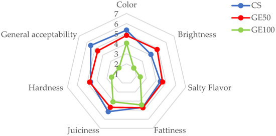 Texture (Table 3) is another very important factor for consumers in reference to meat products. The backfat replacement with GE had no effect (p < 0.05) on springiness and cohesiveness. For these parameters, no statistical differences were found between CS and GE50 and GE100. However, the replacement of fat with GE in sausage formulation produced a significant decrease (p < 0.05) in the hardness of the samples which was dependent on the replacement degree. The higher the substitution, the lower the hardness. These results were opposite to those reported by Pintado et al. [2] and Nacak et al. [9], who mentioned that sausages increased in hardness when fat replacement with gelled emulsion was increased, due to lipid–protein interactions.