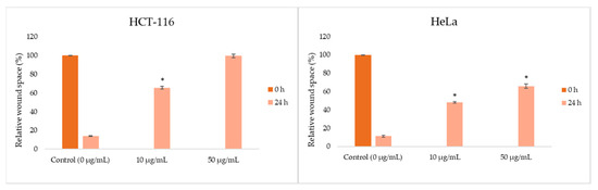 Antimigratory potential was evaluated by the wound healing assay [7] 24 h after treatment with two selected nontoxic concentrations (10 and 50 μg/mL). Results were obtained by measuring wound space between the edges on micrographs, calculated using ImageJ software and presented as values of relative wound space in percent (mean ± SE). * p > 0.005 was considered to be significant.