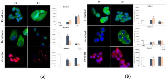 PL increased the expression of antimigratory marker E-cadherin and significantly decreased the level of promigratory/proinvasive proteins N-cadherin and Vimentin in SW-480 cells. Meanwhile, LE induced a similar response in HCT-116 cells, increasing E-cadherin and lowering N-cadherin and Vimentin (Figure 1).