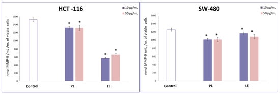 Effects of PL and LE treatments on MMP-9 concentration in HCT-116 and SW-480 cells. * p > 0.05 is considered as statistical significance.