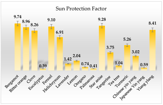 On the other hand, helicrysum, turmeric, tangerine, and Chinese yin yang EOs showed minor SPF values, 6.91, 5.26, 3.75, and 3.02, respectively. Further, it was observed that eucalyptus, lavender, lemon, oregano, palmarosa, tea tree, and Japanese yin yang EOs possessed very low sun protection factors, around 2 or less.
