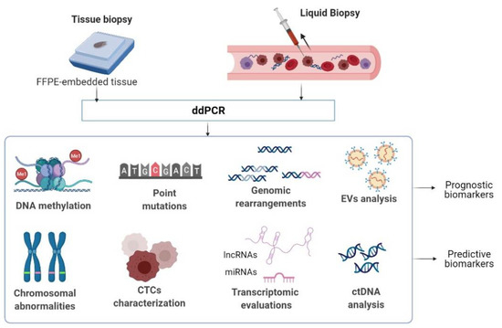 ddPCR is useful both for the analysis of archived tumor tissues, which are degraded and have a limited concentration of DNA, and for the analysis of biological fluids [21]. In recent years, liquid biopsy (LB), based on the analysis of circulating components derived from tumors—circulating tumor DNA (ctDNA), RNA, extracellular vesicles (EVs), or tumor cells (CTCs) has gained tremendous attention because of its potential to provide in real-time an accurate description of the genetic landscape of a tumor [22]. LB has proven to be more informative than tissue biopsy, which is spatially limited and ineloquent for tumor evolution [22]. Thus, only by analyzing the biological material from patients’ body fluids, researchers and clinicians can obtain valuable information on the dynamics of the genetic profile of the tumor, which can be integrated and used to guide the therapeutic management for each patient [20]. Due to its versatility and ability to operate with small amounts of biological material, ddPCR is an ideal methodology for analyzing LBs (Figure 1) [21]. Several blood-based biomarkers interrogated by ddPCR have also found diagnostic, predictive, and monitoring applications in certain malignancies [21]. Novel approaches use some other body fluids such as cerebrospinal fluid (CSF) or urine to screen for and validate biomarkers in cancer patients [21]. However, in this article, we aim to briefly present the applications of ddPCR for biomarker research in CM.