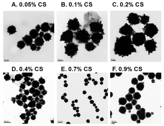 TEM of AuNSs. (A) TEM of AuNSs from 0.05% CS experiment, scale bar = 0.2 μm; (B) TEM of AuNSs from 0.1% CS experiment, scale bar = 100 nm; (C) TEM of AuNSs from 0.2% CS experiment, scale bar = 50 nm; (D) TEM of AuNSs from 0.4% CS experiment, scale bar = 200 nm; (E) TEM of AuNSs from 0.7% CS experiment, scale bar = 0.2 μm; and (F) TEM of AuNSs from 0.9% CS experiment, scale bar = 100 nm.