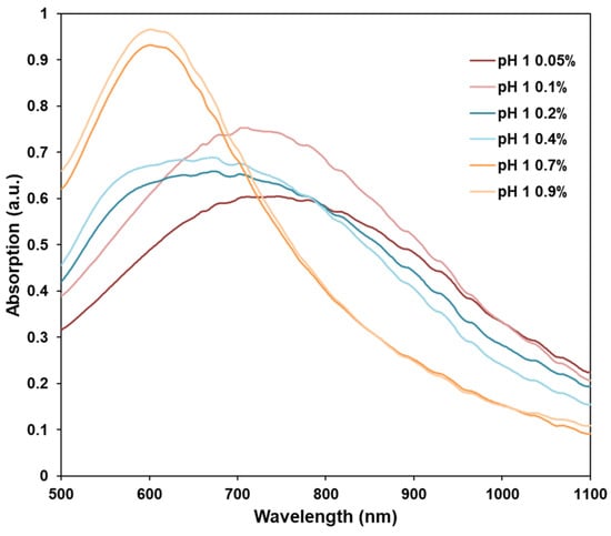 The TEM images are shown in Figure 1. The AuNSs that were obtained from the experiments with 0.05% to 0.4% (m/v) CS had elongated and sharp tips; meanwhile, the AuNSs from 0.7% to 0.9% (m/v) CS had short and unsharp tips. The nanoparticle sizes of AuNSs ranged from 111 to 225 nm. As shown in Figure 2, the AuNS solution from the 0.05% to 0.4% (m/v) CS experiments had absorption peaks from 685 to 750 nm and strong broadband absorption in the NIR region. Meanwhile, the AuNSs from 0.7% to 0.9% (m/v) CS experiments had an absorption peak at 605 nm and weak absorption in the NIR region.