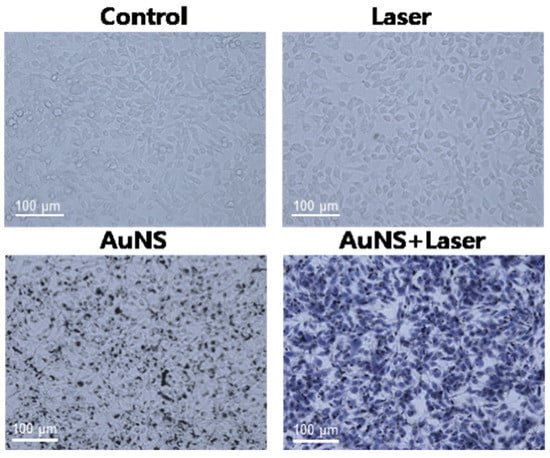 Breast cancer cells, MDA-MB 231, which was chosen as the cancer cell model, were divided into four groups: control, NIR laser, AuNS, and AuNS + NIR laser. The trypan blue staining method was used to discriminate the dead and damaged cells. As shown in Figure 3, only the cells in the AuNS + NIR group were blue, which indicates the dead and damaged cells. An NIR laser or AuNSs alone did not cause damage to the cells.