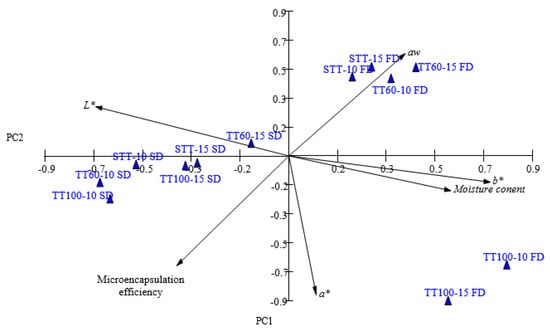 The principal components (PC) 1 and 2 explain 46.7 and 38.1% of the observed variability, respectively, totaling around 85%. As can be seen, PC1 allowed separation of the microcapsules obtained by spray-drying from those freeze-dried, while PC2 allowed discrimination within the microencapsulated chia oil by freeze-drying, the systems whose aqueous phases were treated at 100 °C, 30 min of the rest of the microcapsules. Thus, taking PC1 into account, the powders obtained by spray-drying appeared associated with the highest microencapsulation efficiencies and greatest luminosity. On the other hand, microencapsulated oils by freeze-drying were associated with higher moisture levels, water activity, and the color parameter b* (more yellowish). Regarding PC2, the microcapsules obtained by freeze-drying from parental emulsions whose aqueous phases received the most intense heat treatment were associated with a higher a* value, a higher microencapsulation efficiency, and a lower level of aw.