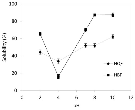 Protein solubility. Figure 1 shows HBF and HQF protein solubility. HBF showed significantly higher solubility and a greater range of variation with the pH (65.10–87.54%) than HQF (p < 0.05). The minimum protein solubility was at pH 4 (16.22 and 33.77% for HBF and HQF, respectively). The higher protein solubility in HBF could be due to its greater exposure of polar amino acid that interacts with water through hydrogen bonding. The inconsistency between the lower DH and higher solubility in HBF could be due to the balance between hydrophilic and hydrophobic forces scores over DH.