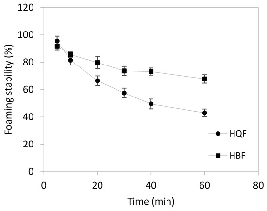 Foaming stability of HBF (■) and HQF (•) as a function of time.
