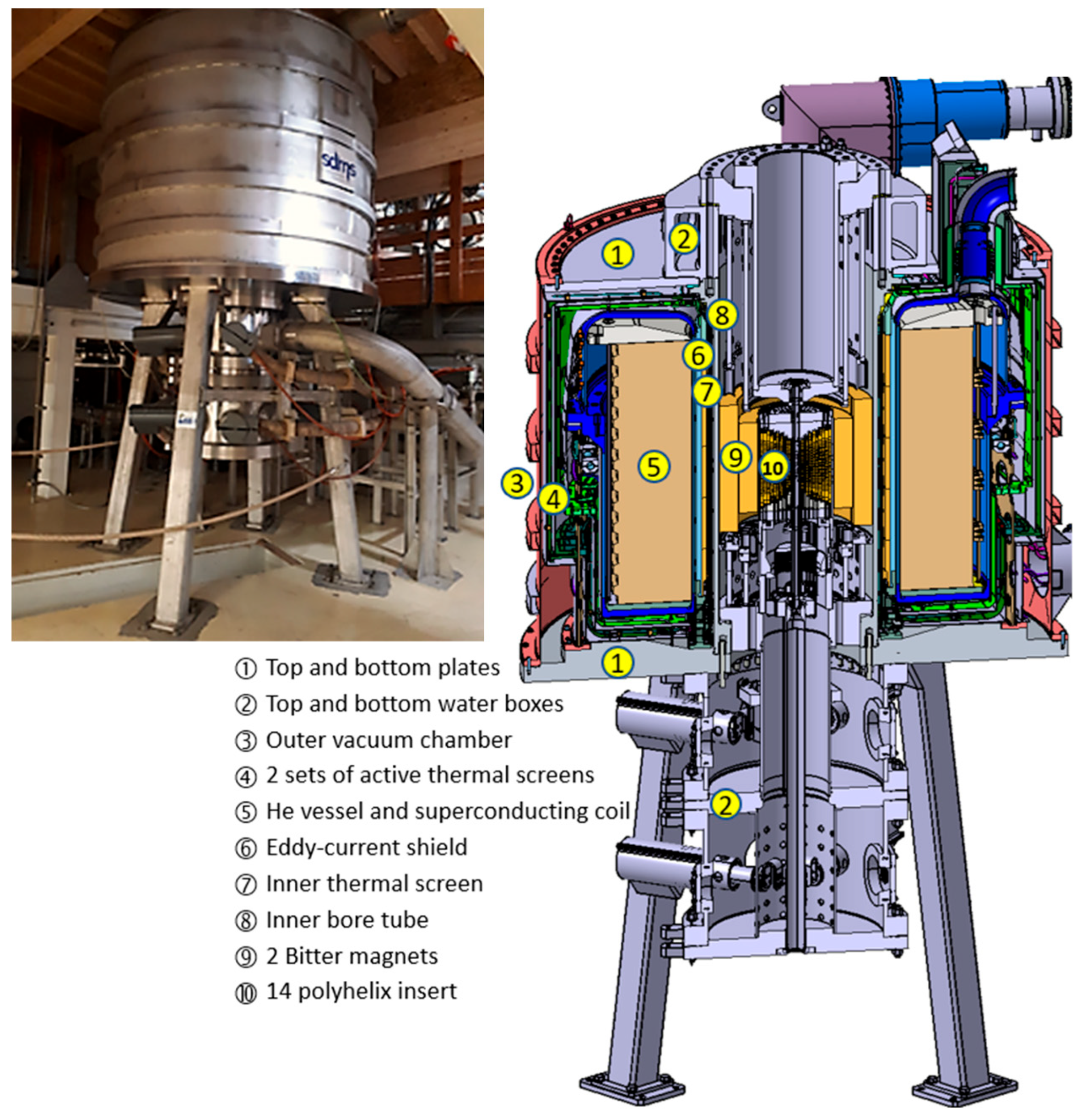 The highest DC magnetic fields are produced today with hybrid magnets, i.e., magnets combining resistive and superconducting technologies. The Grenoble hybrid magnet is composed of Cu-Ag resistive inserts made of polyhelices [18] and Bitter coils [19] surrounded by a large-bore Nb-Ti/Cu superconducting solenoid (Figure 1). Its unique feature is to be modular, with the multiple configurations listed in Table 1, which were recently successfully commissioned, with a maximum field of 42 T reached as a first step for the “full” hybrid magnet configuration [20]. The details of the high electric power installation as well as the cryogenic infrastructure needed to operate such a hybrid magnet are reported in [21] (see also Supplementary Materials).