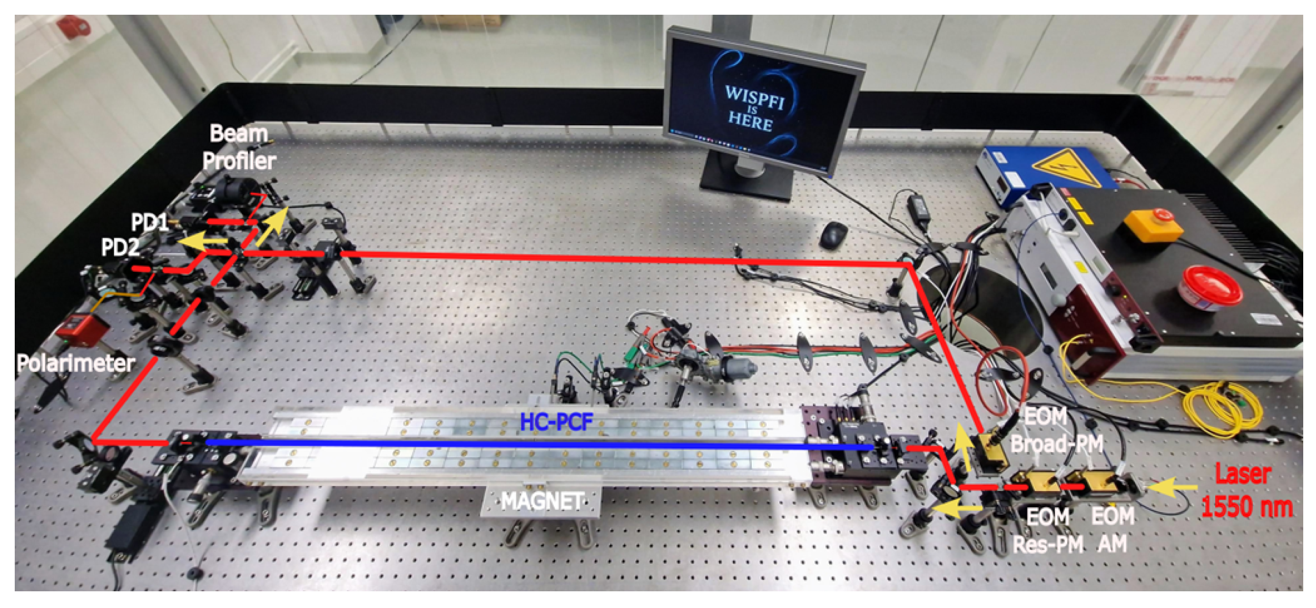 Finally, a fully automated Python-based (3.12) data acquisition (DAQ) system has been designed that monitors multiple system parameters, including polarization, beam profile, laser power, laser wavelength, temperature, and humidity. These measurements will provide the quality criteria for the analysis, ensuring stable conditions and reproducible measurements throughout the experiment. A photograph of the current laboratory implementation of the WISPFI prototype is shown in