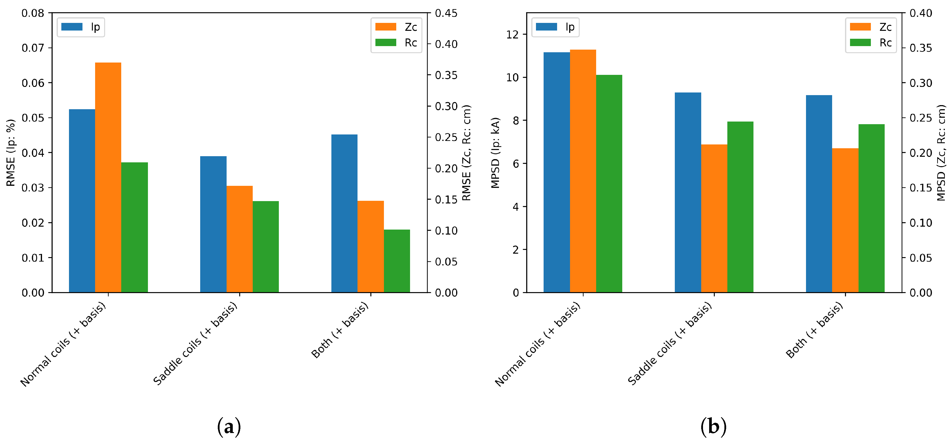 Three “experiments”, using different sets of available diagnostics, were performed. In each experiment, we evaluated our inference method relying on all 180 equilibria. Each equilibrium was used ten times with a different value for the noise on the diagnostic measurements. This resulted in a total of 1800 inferences. The three experiments always used flux loops and tangential coils, and these two diagnostics will be referred to as “basis”. To this basis, we added normal coils in the first experiment, saddle coils in the second, and both normal and saddle coils in the third.