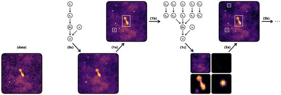Visualization of the iterative pipeline applied to a simple imaging problem (synthetic, noisy data on the left). Using a single component model (upper left graph), it generates a preliminary reconstruction (0c), in which it identifies point sources and objects (1a), marked with crosses and boxes, respectively. Adding them (represented as side branches) to the existing model (1b) yields separate reconstructions for each component (1c), which are composed into a full sky image, allowing for another object detection in this composite image (2a). This procedure can be repeated for further refinement.