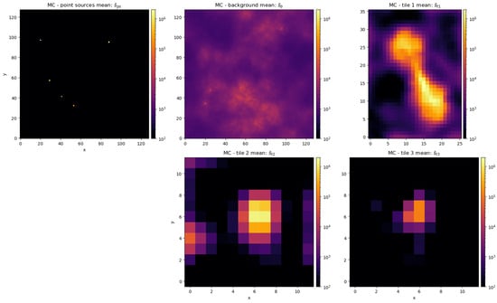 Reconstructed model component images (mean) of the advanced, multi-component model (MC). The individual tile components and the point sources are well separated from each other and from the background, which captures all remaining structures.