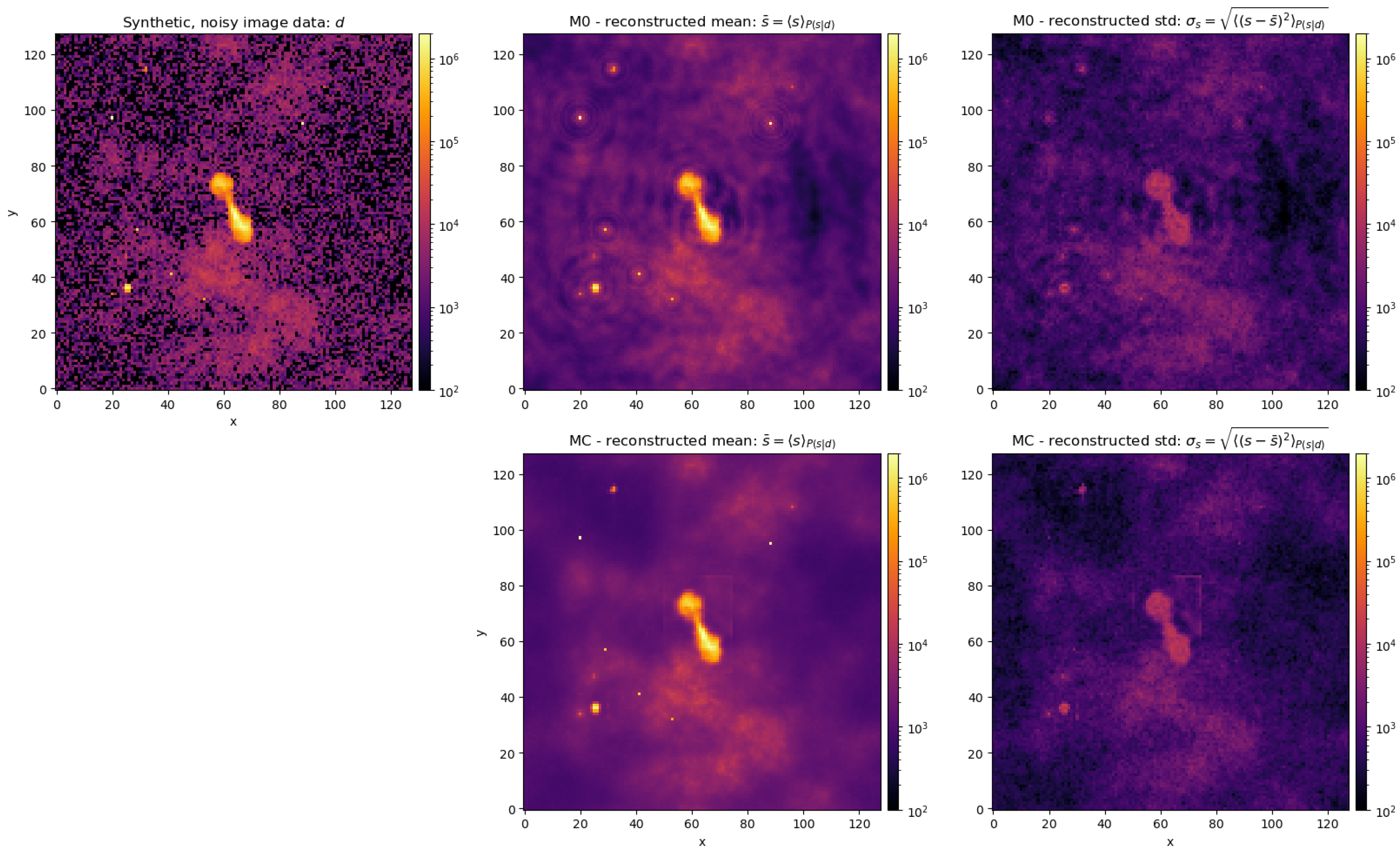 In order to obtain a more accurate approximation of the posterior probability distribution with reliable uncertainty maps, we use geometric variational inference (geoVI), an accurate but also more costly variational inference technique []. GeoVI is able to capture non-Gaussian posterior statistics and intercorrelation between the posterior parameters. It outputs a set of posterior samples, from which the mean of the signals and their standard deviation can be computed.