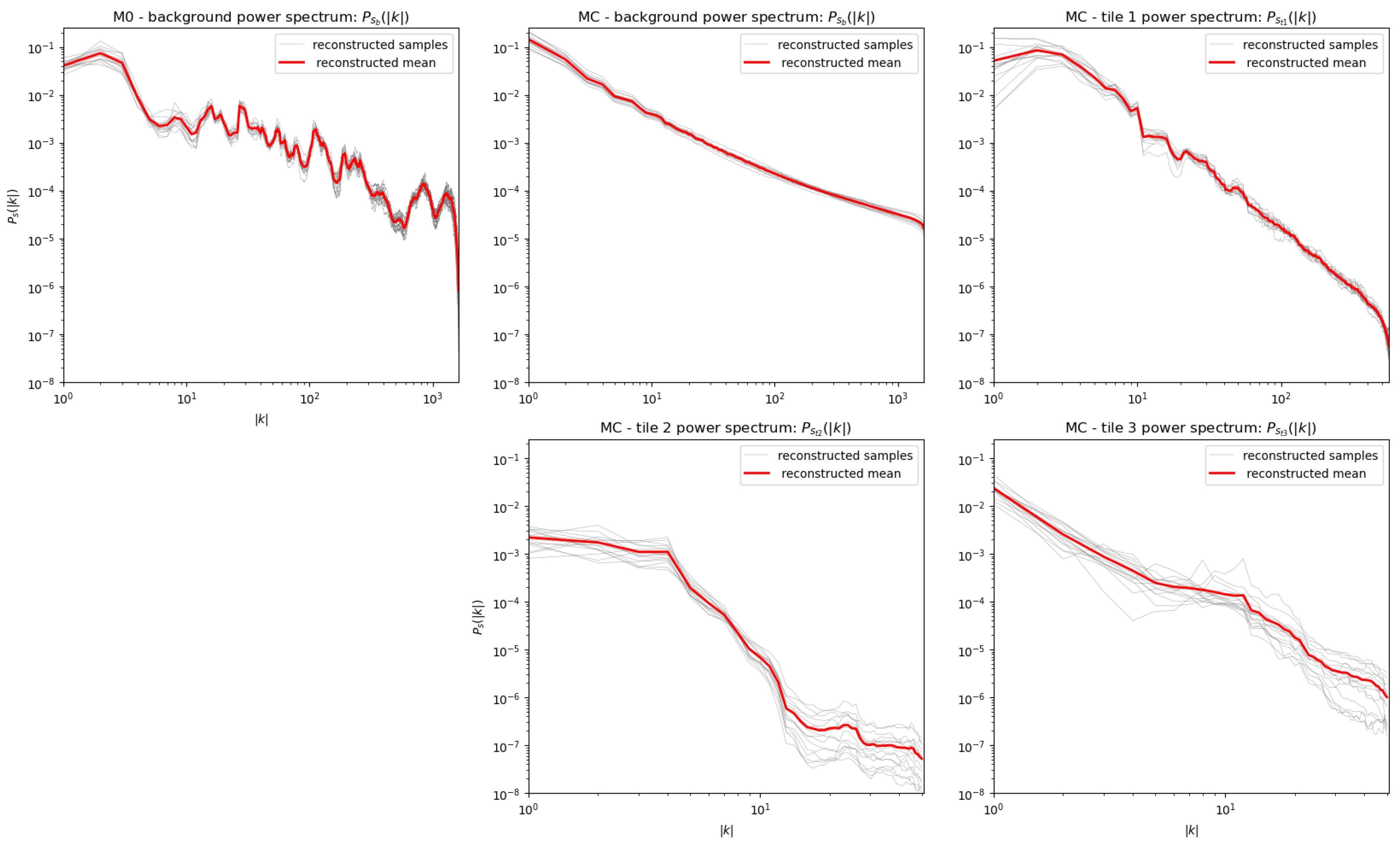 For the imaging problem shown in Figure 1, the pipeline only needs a few iterations to identify all objects and build an improved model. It successfully detects all noticeable point sources and compact objects, allowing for a separate modeling in the next reconstruction step. For further investigation, we compare the initial model (M0) of step (0c) and the advanced, multi-component one (MC) of step (2c) by optimizing them with geoVI until convergence. We plot the reconstructed full sky images in Figure 2, the individual model components of MC in Figure 3, and the corresponding learned power spectra of all diffuse model components in Figure 4. We observe that M0 is already sufficient to achieve a good reconstruction of the data. However, using MC further improves the overall reconstruction and, in particular, the modeling of the point sources and the tile components. The individual components are well separated from each other and from the point sources. Moreover, the plotted power spectra differ significantly; whereas the spectrum of M0 shows many small-scale features, those are captured by the individual tile components and point sources in MC, leading to a smoother and steeper background power spectrum. Furthermore, the spectra of the individual tile components show different correlation properties.