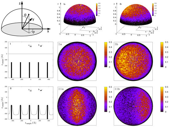 First row: Geometry for the representations in Ia, Ib, IIa, and IIb of reflected D-ion intensities. The D-ions are reflected onto the (-)-polar hemisphere, which is shown from a perpendicular view in the second and third rows. The colour scale in the (-)-polar plots corresponds to the intensity of the reflected D-ions. Different sample surfaces: In the middle row (I), the sample has a clean surface extending in the xy-plane at = 0 Å. Tungsten pillars are buried 140 Å below the surface, and is of no importance for the results in the second row. The sample faces non-destructive perpendicular irradiation from the z-direction (case a, middle panel) or diagonal irradiation from the xz-direction with an incident angle of 45 deg (case b, right panel). In the last row (II), the sample shows a surface generated by 0 deg ion beam with a fluence of 800 atoms/ (left panel), so the tungsten pillars become uncovered, representing a rough surface. Again the sample is exposed to non-destructive irradiation by a D-ion beam with = 200 eV: incident angle: 0 deg (a, middle panel); incident angle: 45 deg (b, right panel).