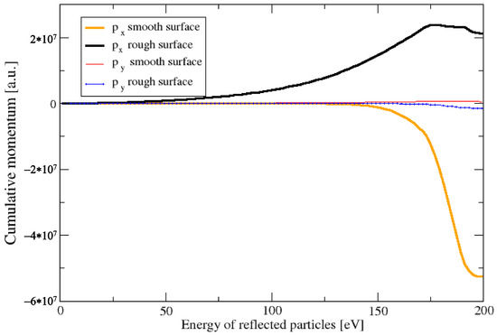 Momentum distribution px and py as functions of reflected particle energy for an ion beam angle of 50 deg.
