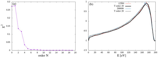To enable a complete and efficient replacement of the full scattering data in PWI codes with a compact representation of the reflected ion distribution as defined in Equation (1), the energy dependence of the expansion coefficients must be explicitly incorporated. While these coefficients may vary non-uniformly across the energy range , their values are constrained within this interval. This bounded support makes Chebyshev polynomials particularly suitable for approximating (cf. Chapter 5.8 in [7]). Figure 4b presents a 20-degree Chebyshev fit to the coefficient for two reflected deuterium distributions at = 200 eV. Despite statistical fluctuations inherited from the Monte Carlo sampling in SDTrimSP, the fitted curve exhibits a smooth, monotonic behaviour that is both numerically stable and easily interpolable. The original energy grid—comprising 1000 points spaced at 0.2 eV intervals—thus reduces to just 20 coefficients, yielding a compression factor of 50. Combined with the angular reduction factor of 36 from the hemispherical basis, the total data compression reaches 36 × 50 = 1800, resulting in a highly compact yet physically representative description of the full reflection distribution.