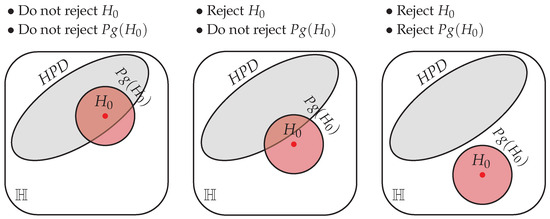Illustration of the FBST for a precise and its pragmatic version, , in the hypothesis space . Each panel presents a possible configuration of the hypotheses and the HPD, with the text above the panels indicating the conclusion.