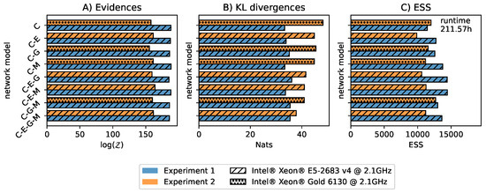 For each model variant, we show the (A) model evidences, (B) Kullback-Leiber (KL) divergences from prior to posterior, and (C) effective sample size (ESS) as defined for NS. In contrast to classical NS, computing the uncertainty for the model evidences and KL divergences in diffusive NS is not straightforward [10,28]. We estimated the uncertainties for the model evidences and KL divergences by resampling the level compression 100 times, as implemented in DNest4. The relative uncertainties for the evidences and KL divergences estimated by DNest4 were below 0.02%.