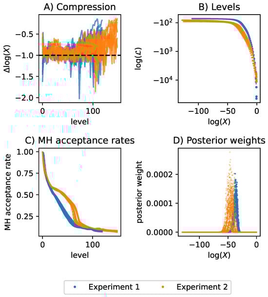 Diagnostic plots for TDNS applied to Experiment 1 and Experiment 2. (A) The compression is defined as the logarithmic difference in enclosed prior mass X between adjacent likelihood levels. The target-compression was set to the Euler number e. Especially towards the higher levels, the compression was often low with respect to the target-compression, meaning that levels were created too closely. Low compression indicates computational overhead. (B) The created likelihood levels as a function of the enclosed prior mass X. We plot the log likelihood on a log-scale to highlight the difference in levels between both experiments. (C) Metropolis-Hastings (MH) acceptance rate of the MCMC proposals that evolve the particles. Towards higher levels, the acceptance rate declines, because it becomes harder and harder to generate proposals within the prior regions enclosed by higher and higher likelihood levels. If the acceptance rate reaches 0 before the bulk of the posterior is found, TDNS is stuck. Interestingly, for all runs of Experiment 2, there is a bulge in the decline of the acceptance rate. (D) In the plot of the posterior weights over the enclosed prior mass X, the posterior weights tend to 0 as X decreases, indicating that the bulk of the posterior mass was found for both experiments and all models.