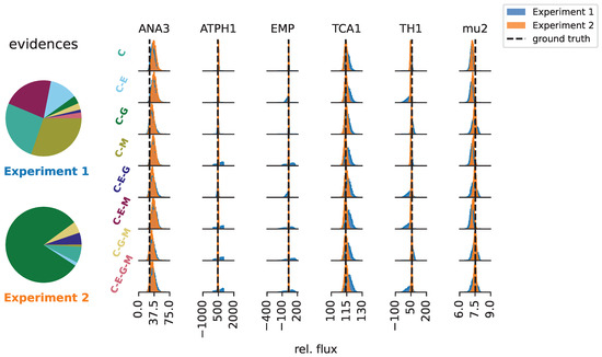 The model and parameter inferences for Experiments 1 and 2 are shown in Figure 4. Notably, the data-generating model “C-E-G” was not assigned a high probability in either experiment. Experiment 1 did not assign a high probability to any specific model. In contrast, Experiment 2 classified the “C-G” model as the most likely one, and the alternative models that contain pathway “G” together accounted for 90.08% of the evidence. Therefore, Experiment 2 identified pathway “G” with high certainty. The failure of Experiment 1 to find “G” was due to the uninformative input substrate, which resulted in measurements that were uninformative with respect to the presence of “G”. By contrast, pathway “E” was not detected at all and accounted for only around 6.7% of the evidence. It is not surprising that the experiments failed to find all pathways, as it has been demonstrated for E. coli that even the combination of several 13C MFA datasets is often insufficient to accurately resolve all net fluxes and pathways [30]. Independently of the detected pathways, the marginal posteriors for the central net fluxes (i.e., the fluxes belonging to “C”) show substantial posterior overlap across network structures. In other words, although specific pathways were difficult to infer from the data, the central net fluxes were recovered.