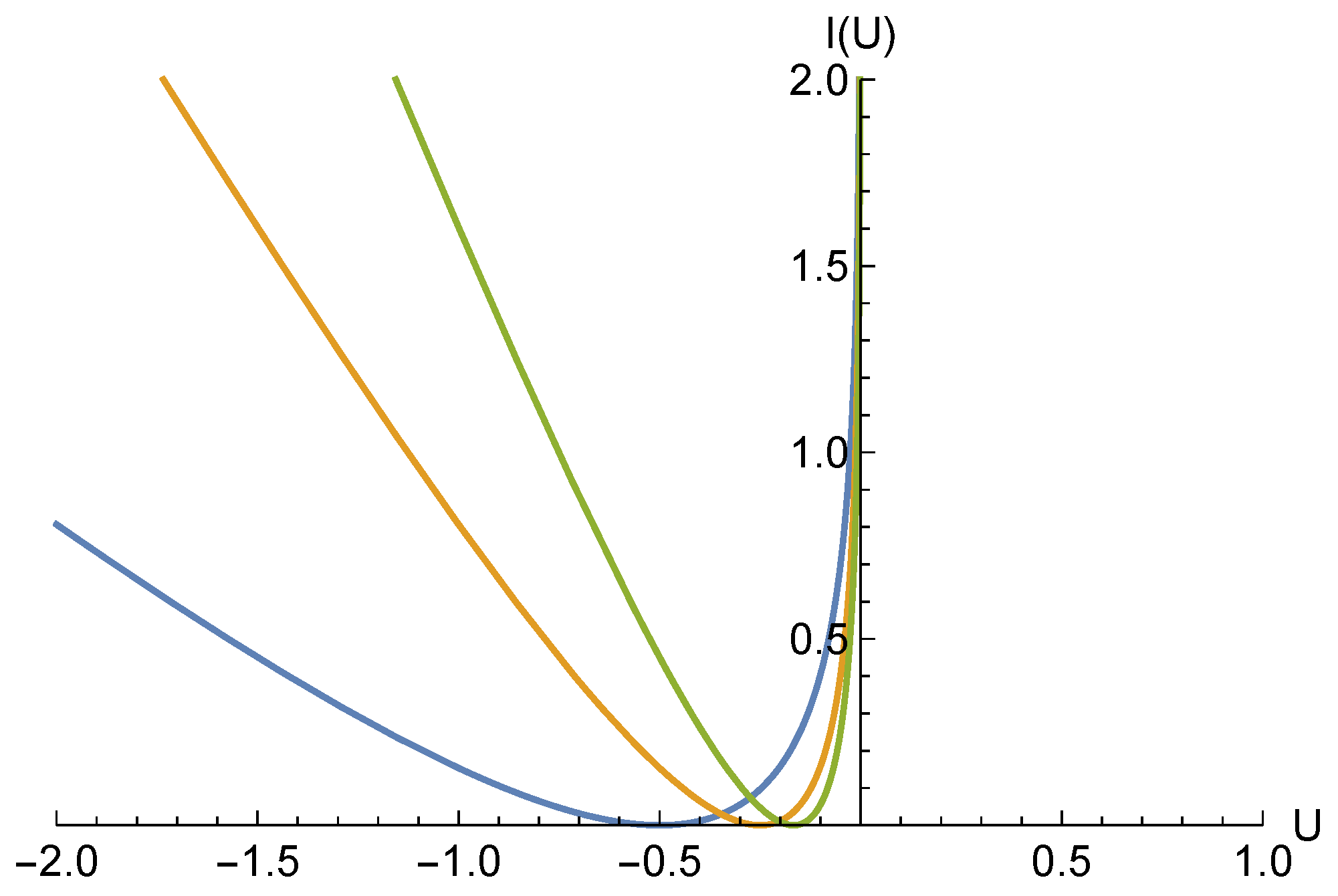 This function is convex, and it is minimized at (i.e., depends on the rate parameter). If the reference measure tends to a uniform (i.e., ), then information is never minimized and the function is decreasing for all . This also means that the inverse temperature is always negative for .