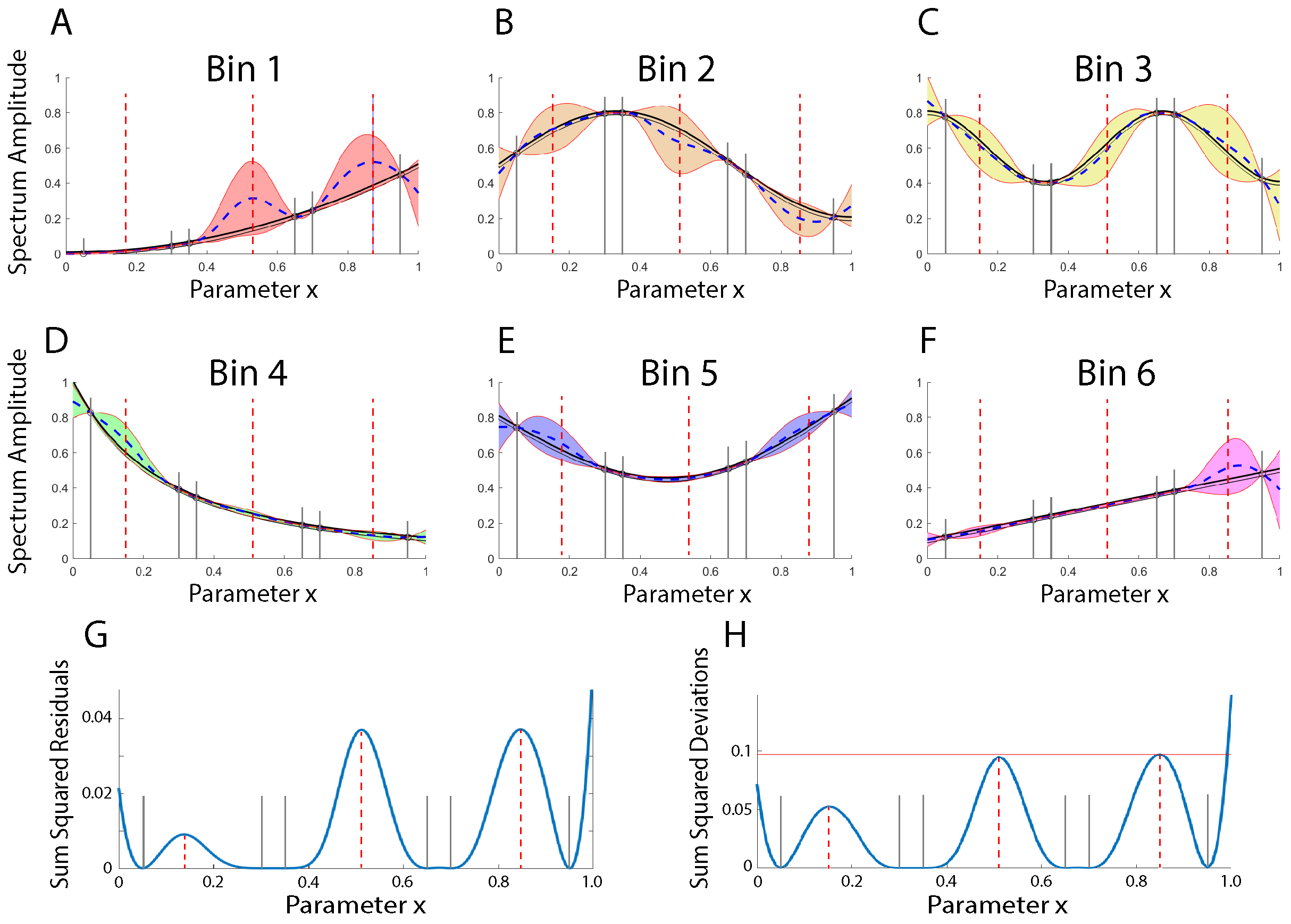 Figure 4G illustrates the combined uncertainties in the predictive distribution, as a function of the parameter x, found by summing the squared standard deviations (variance) of the mean interpolants in each of the bins. This plot summarizes where information is most needed. While the greatest uncertainty remains at the