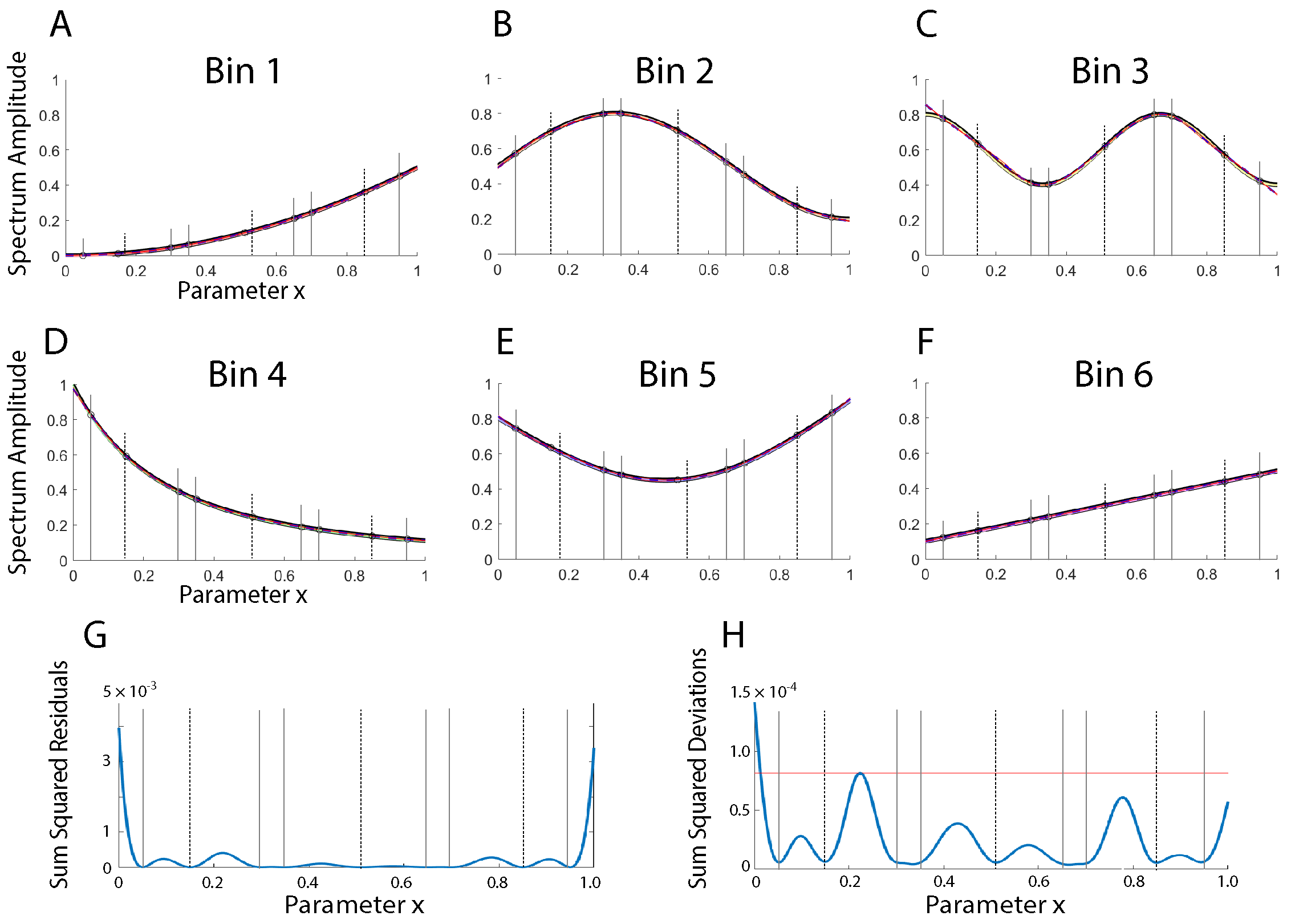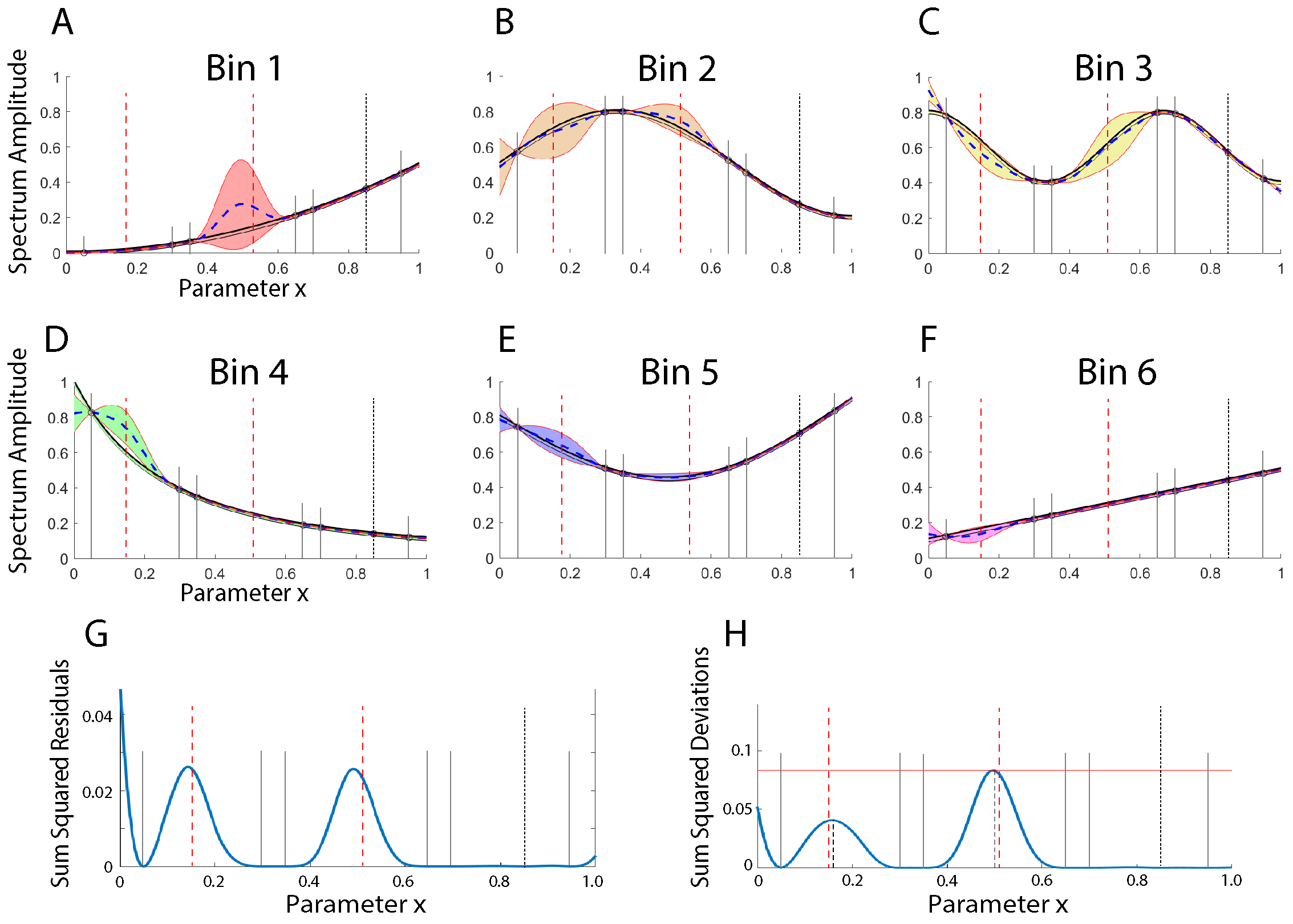 Figure 4A–F depict the plots of the mean estimated spectral functions (dashed curve) for each bin estimated using the six synthetic spectra at