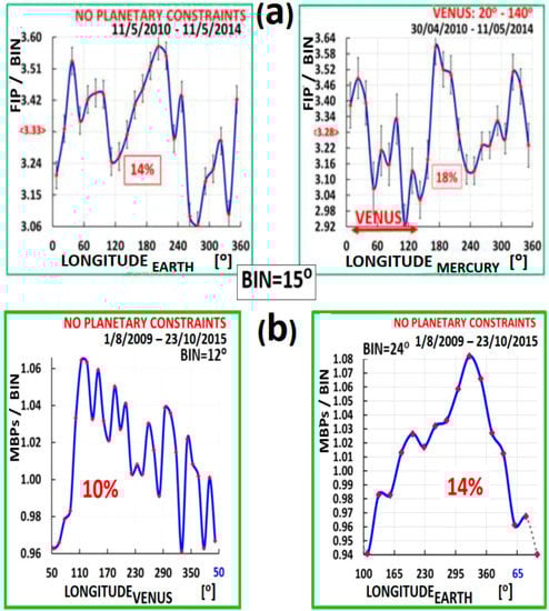 (a) The dependence of the coronal elemental composition [19] to the photospheric one (Ac/Ap), given here by FIP / BIN, is projected on heliocentric longitudes for Earth (left) and the combined Mercury—Venus dependence (right). The relative min⇔ max amplitude is 14% and 18%, respectively; (b) the dependence of the relative Nr. of magnetic bright points (MBPs) [20] projected on heliocentric longitudes of Venus (left) and Earth (right). The estimated error per BIN is about 3.5%. This also follows from the rather smooth shape of Earth’s spectral shape (right). The relative min⇔ max amplitude is 10% and 14%. See also Supplementary Materials with more relevant information.