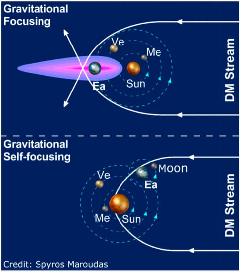 It is worth mentioning here that planetary gravitational lensing effects from a planet is possible within the solar system from one solar body to another one, and most notably from the Sun itself. This is so, because the gravitational deflection depends on 1/(velocity)2, and streaming DM constituents with velocities of around 10−3 c or less can become strongly influenced over distances typical for the inner solar system, including the Earth–Moon distance [8,9]. In between, SOFUE [10] concluded that even the intrinsic Earth can strongly gravitationally enhance the flux of incident streams downstream on Earth’s opposite surface, in a velocity range of up to about 400 km/s covering a large fraction of the expected one for DM. The work of ref. [10] expands the DM scenarios of planetary lensing effects [8,9] between solar system bodies including the Earth–Moon system. The flux enhancement by the Moon towards Earth is about 104 (Manuscript in preparation, A. Kryemadhi, M. Vogelsberger, and K. Zioutas).