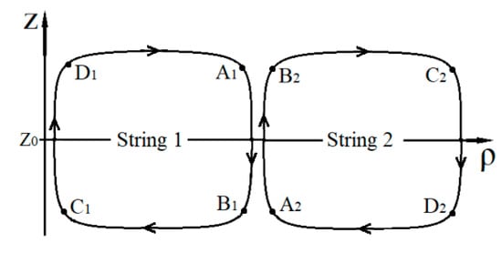 Figure 2, the direction of motion for string 1 defines a sequence of points: A