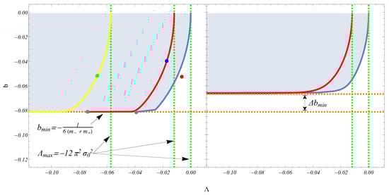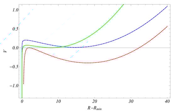 In Figure 1 [17], we can see the aforementioned boundaries as well as the parameter space that allows for stability considering the values of . The minimum value of the parameter b is increased as is increased (see Equation (22)). For the three sets of , displayed as color coded dots in the the right panel of Figure 1, we show their corresponding potentials in Figure 2 [17], noticing that only those potentials that correspond to the parameter sets that exist inside the stability region display a minimum that indicates stability.