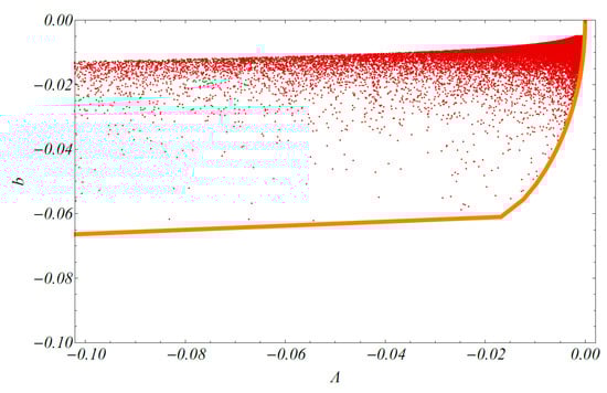 In order to validate our analytical results, we have performed a random Monte Carlo process, selecting a set of points in the parameter space for which there exist stable, spherical shell solutions, as seen in Figure 3 [17]. We have obtained these points by fixing , , and repeating a process of considering random values of within the limits set by the stability constraint (20) such that (see Equation (21)). For each point in the set of values, we derive the stability metric parameters .