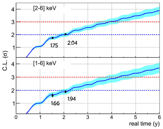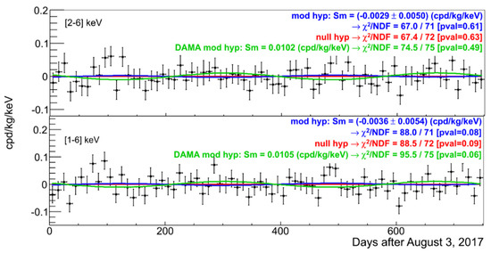 where R0 and R1 are free. The τ parameter was fixed from the time evolution given by the background model for the considered energy region. The period and phase, related to ω and t0, were fixed as 1 y and maximum at 2 June, following the predictions for a standard galactic halo. The modulation amplitude, Sm, was set to zero when considering the null hypothesis. Figure 2 presents the fit of the counting rate to Equation (1) for the two considered energy regions. Results were consistent with the null hypothesis; the best fits for the amplitude under the modulation hypothesis were Sm = −0.0029 ± 0.0050 c/keV/kg/day and Sm = −0.0036 ± 0.0054 c/keV/kg/day for the [2–6] and [1–6] keV energy regions, respectively. These values were compatible at 1σ with the absence of modulation and were incompatible with DAMA/LIBRA result at ~2.6σ. Now, the analysis of the first 3 years of data accumulated (corresponding to 313.6 kg·y) is underway.