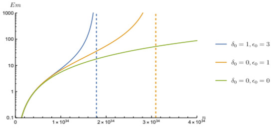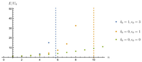 Energy times mass of a particle in a box of width 1 m. The green line represents the ordinary case, and the blue and orange lines represent two different GUP parametrizations. The dashed vertical lines represent the maximum integer n allowed for that particular model.