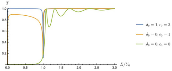 As a second example, let us consider a potential barrier of width and height between and . As in ordinary quantum mechanics, considering a particle approaching the barrier from the left, a generic energy eigenstate is given by a superposition of a left- and a right-moving wave on the left of the barrier, corresponding to a reflected and an incoming wave, respectively; a left- and a right-moving wave in the region of the barrier; and a right-moving wave on the right of the barrier, corresponding to a transmitted wave. Imposing the corresponding boundary conditions, one can then find a relation for the transmission and reflection coefficients. Carrying out the calculations, one can find that resonances in the transmission amplitudes appear at different energies than in the standard case. Furthermore, contrary to ordinary quantum mechanics, only a finite number of resonances are allowed. As in the case of a particle in a box, resonances are related with the sum of the wavelengths of left- and right-moving waves in the region of the barrier. Specifically, a resonance is obtained when the width of the barrier is a half-integer multiple of such a sum. In terms of the quantity , we have