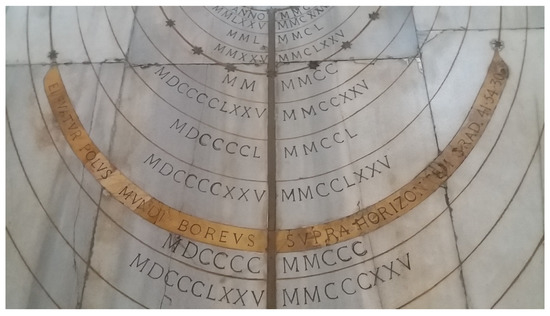 The Celestial North Pole is elevated over the horizon of 41°54′30″, on the yellow marble tarsia. The vertical brass line is the boreal gnomon [1,2].