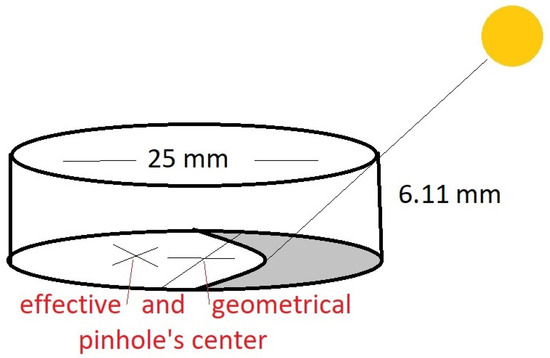 The pinhole’s form and position have been modified since the original one of Francesco Bianchini. As example, in the year 2000, we found an irregular pinhole of about 40 × 15 mm. Now, since 27 October 2018, a circular cylindrical pinhole of 25 mm diameter and 6.11-mm thick is in place (Section 3.1). The thickness determines a seasonal change of the effective aperture and of the effective center of the pinhole, with the meridian solar altitude’s change (Figure 4). The present diameter is slightly larger than the original one of Bianchini (20 mm) to give more light for the winter Sun, in a Basilica with wide windows, no longer obscured during the observations as in 1700s. The position of this pinhole’s center is not the same as in 1702, and it was calibrated with the winter solstice (Section 2.7).