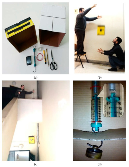 Improvised elevator for conducting experiments concerning the EP: (a) materials needed to assemble the device; (b) elevator in free fall; (c) elevator moving upwards at constant acceleration; (d) spring scale measurement during free fall equaling 0 N, 0 g, while a 100 g body is suspended from the spring’s free endpoint.
