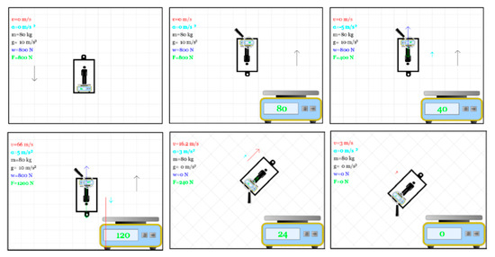 Indicative software snapshots showing a number of ways of elevator movement (various values of velocity and acceleration, as well as direction of movement), while measuring magnitudes of mass, weight, normal force and showing corresponding vectors.